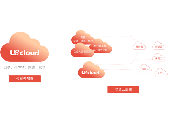 公有云部署:云應(yīng)用和ERP業(yè)務(wù)均部署在公有云,這種模式使用成本較低,數(shù)據(jù)保護(hù)方面也比較有保證,且方便擴展云服務(wù) 混合云部署:云應(yīng)用部署在云端,企業(yè)ERP部署在企業(yè)內(nèi)部,相互獨立,但在云的內(nèi)部又相互連通,可以發(fā)揮出各自的優(yōu)勢