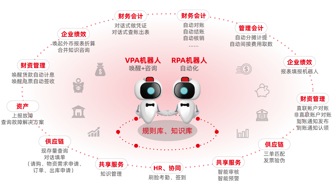 用友NC Cloud 應(yīng)用人工智能技術(shù)(例如:交互式語音、LBS、OCR技術(shù)),結(jié)合實際業(yè)務(wù)場景,全新設(shè)計VPA工作助手(人機交互、智能問答......)、RPA流程機器人(自動對賬、結(jié)賬、核銷、發(fā)票驗偽、三單匹配、報表填報......),用AI技術(shù)引領(lǐng)智能應(yīng)用新方向,重塑用戶新體驗。