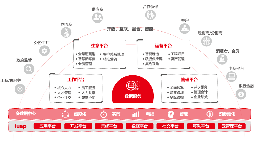 用友NC Cloud基于iuap社會化商業(yè)應(yīng)用基礎(chǔ)平臺,圍繞人、財、物、客四大管控對象,幫助企業(yè)構(gòu)建面向社會化商業(yè)的工作平臺、管理平臺、運營平臺和生意平臺,連接全球、全網(wǎng)、全域資源,賦能企業(yè)實現(xiàn)基于技術(shù)驅(qū)動的業(yè)務(wù)變革和商業(yè)創(chuàng)新。