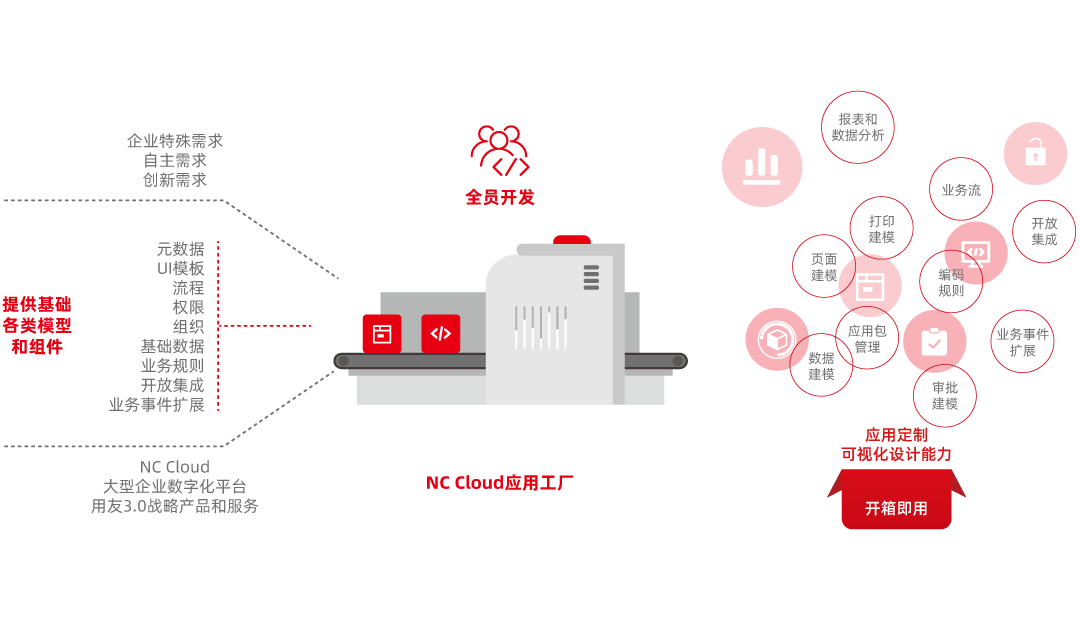 用友NC Cloud應(yīng)用工廠作為零代碼開發(fā)平臺,為企業(yè)提供了各類基礎(chǔ)模型和組件(如元數(shù)據(jù)、UI模板、流程、權(quán)限、組織、基礎(chǔ)數(shù)據(jù)、業(yè)務(wù)規(guī)則、開放集成、業(yè)務(wù)事件擴展等),支持全員開發(fā),真正開箱即用,基于個性化定制開發(fā)的模式,滿足企業(yè)在數(shù)智化時代的自主創(chuàng)新需求。