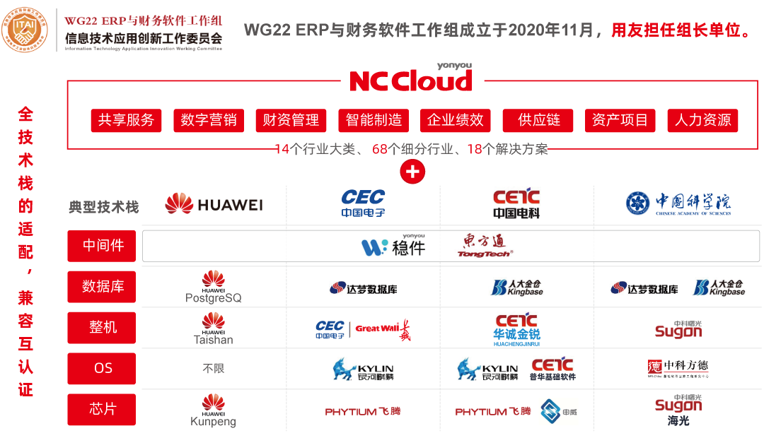 為了推動信創(chuàng)產(chǎn)業(yè)發(fā)展,用友參與了信創(chuàng)聯(lián)盟、信創(chuàng)工委會、WG22 ERP與財務(wù)軟件工作組等組織機構(gòu)。用友NC Cloud與華為鯤鵬體系和中國電子PKS體系等國內(nèi)主流的信創(chuàng)產(chǎn)品進行全棧適配。截止2021年5月,用友NC Cloud已與近50個國產(chǎn)化產(chǎn)品實現(xiàn)兼容認證,形成安全可信的數(shù)智化解決方案。