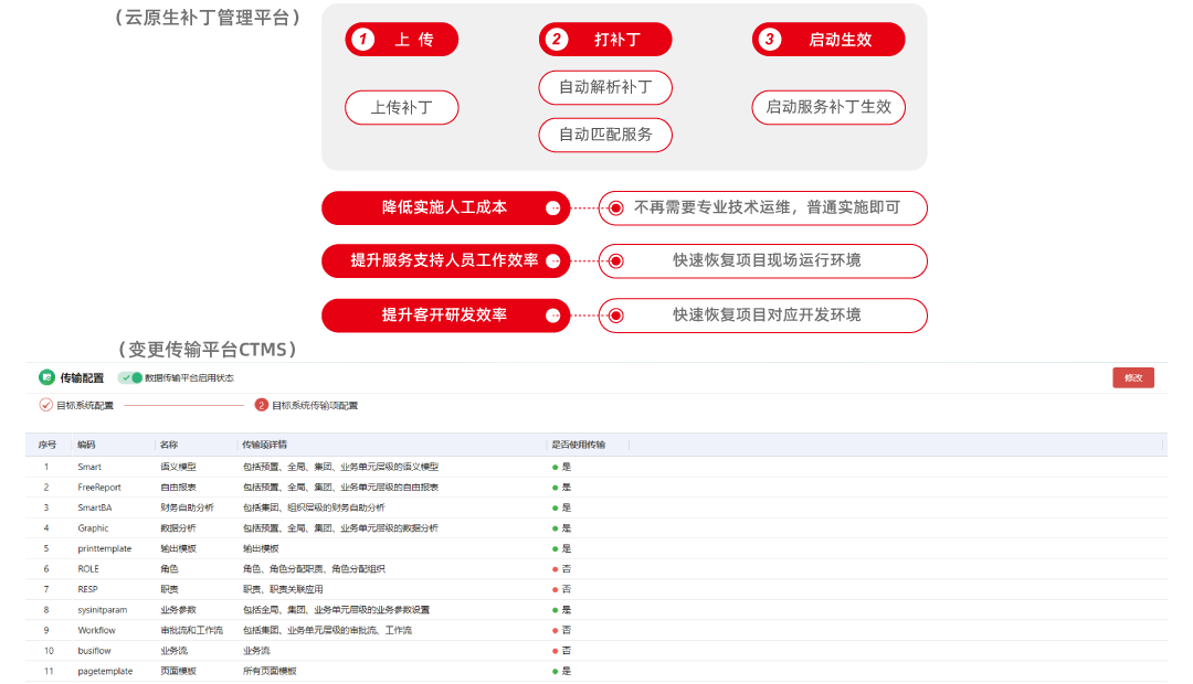 用友NC Cloud提供了可助力企業(yè)在云模式下高效運維的B類工具,通過變更傳輸平臺CTMS、云原生補丁管理平臺,保證業(yè)務(wù)系統(tǒng)的連續(xù)、可靠、一致性,同時縮短項目工期,提升實施、服務(wù)、客開等支持人員的交付效率 。